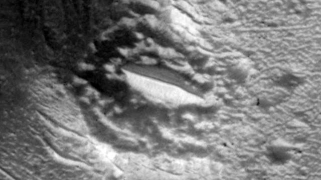 L'image enregistrée par la sonde Mars Reconnaissance Orbiter de la NASA montre la bordure nord de Deuteronilus cratère sur Mars. Dans la partie nord de l'image, en haut au centre, vous pouvez voir le bord du cratère et des collines martiennes. A la base de la chaîne de l'une des collines, au fond du cratère, nous voyons une zone semi-circulaire mystérieuse.