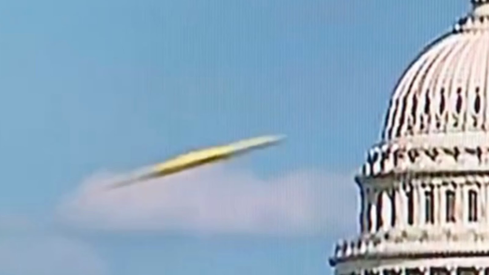 L'OVNI de couleur jaune apparaît soudainement sur le côté gauche de l'écran, passe à haute vitesse le bâtiment du Capitole avant qu'il ne disparaisse de l'écran.